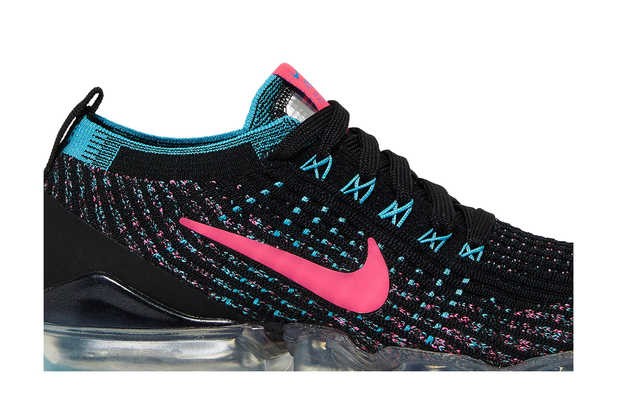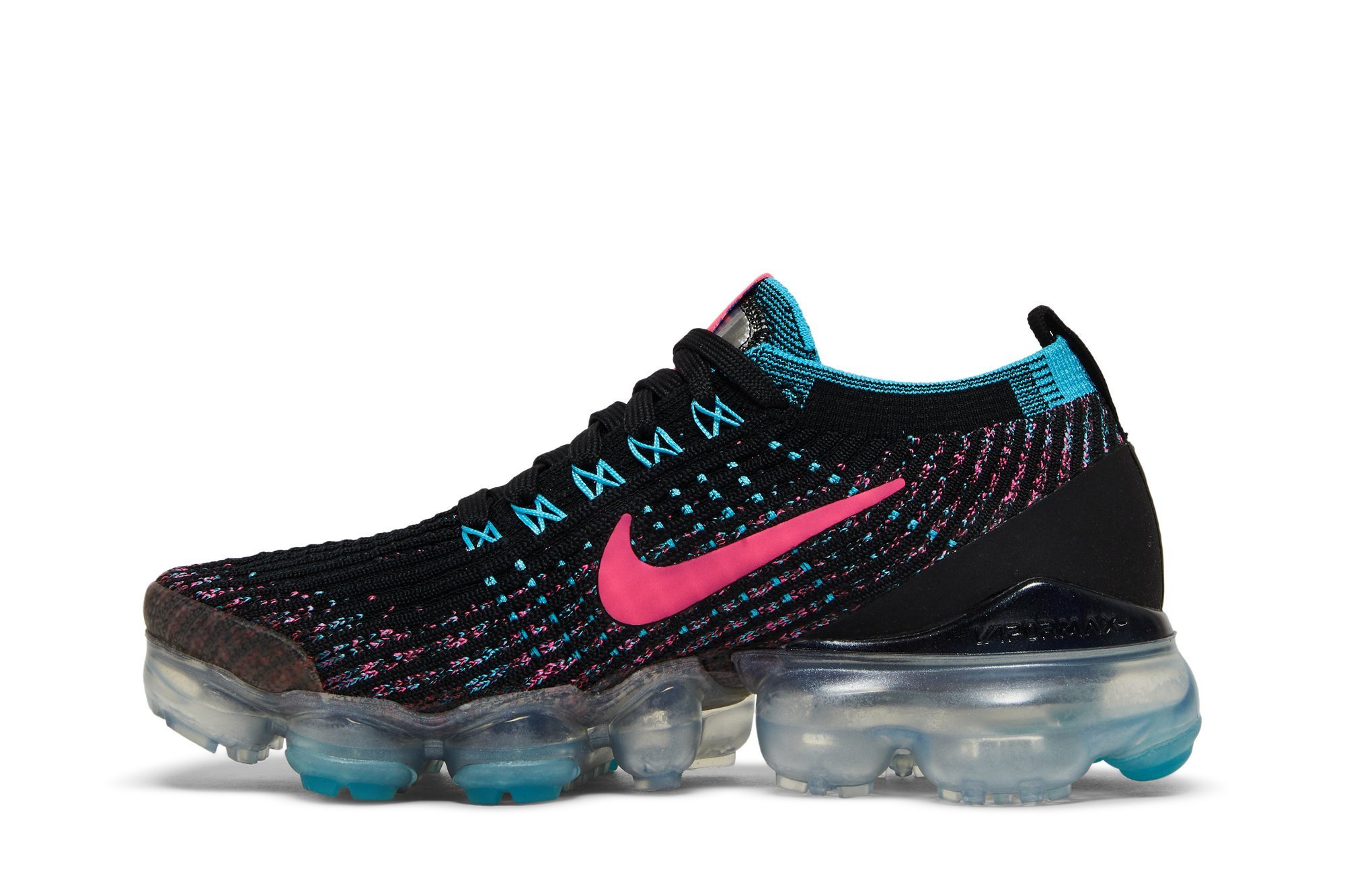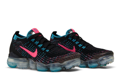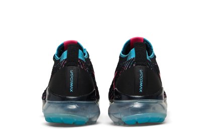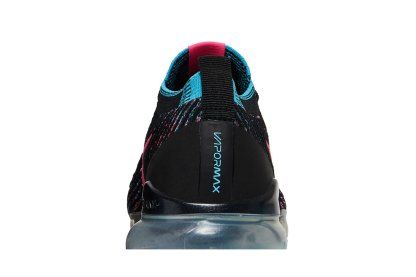 The Nkhjgike womens Air VaporMax Flyknit 3 Black Hyper Pink Blue showcases vivid accents on a lifestyle runner that marries a sock-like upper with plush cushioning that extends from heel to toe. The sneakers black Flyknit construction is enlivened with contrasting fibers in Hyper Pink and Baltic Blue. The former hue appears on the signature Swoosh, while the latter hue is applied to integrated Flywire cables. A full-length VaporMax platform offers a smooth ride.